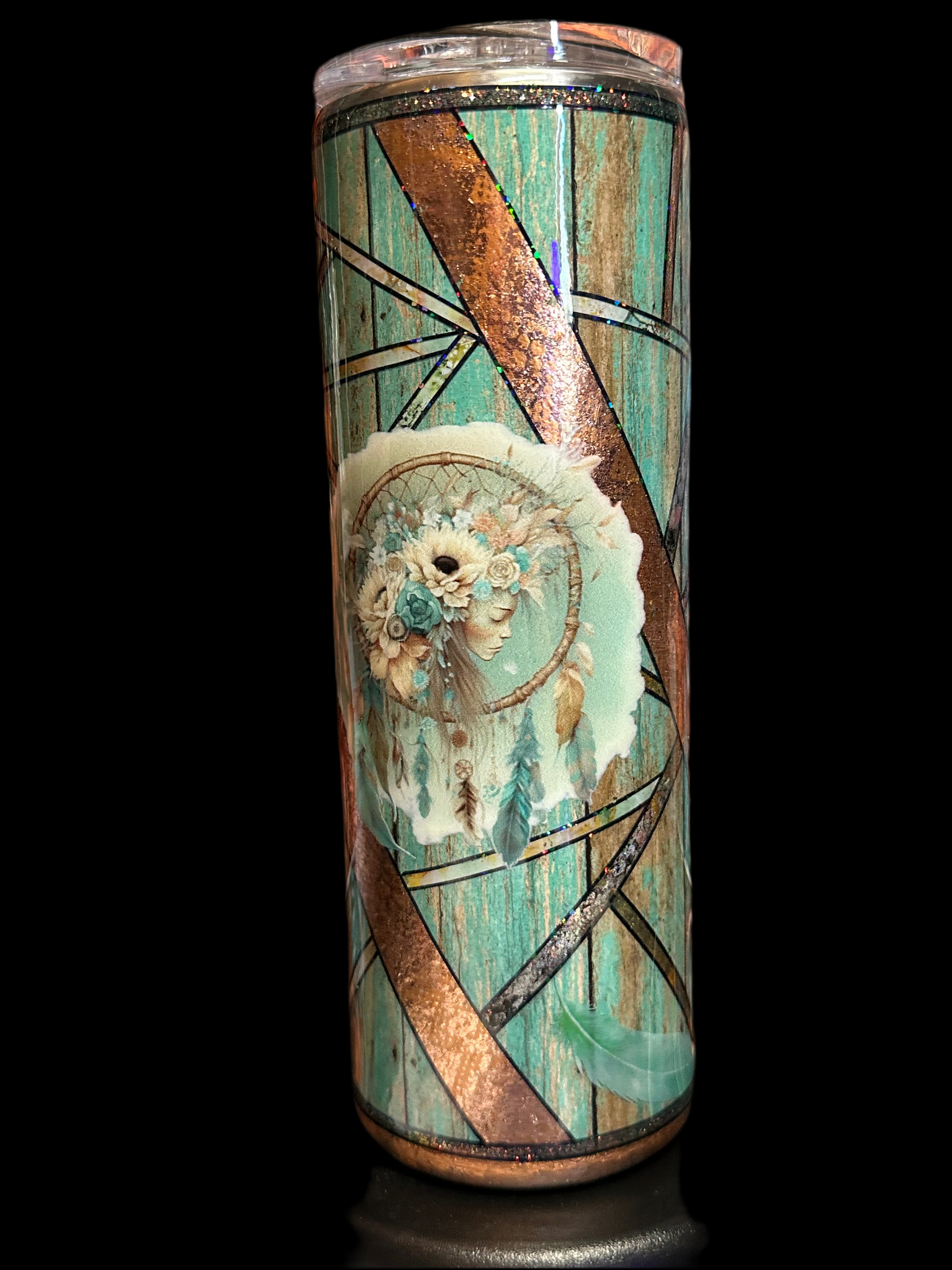 Art done with epoxy on a 20 ounce Tumblr with a Dreamcatcher and sing on it.