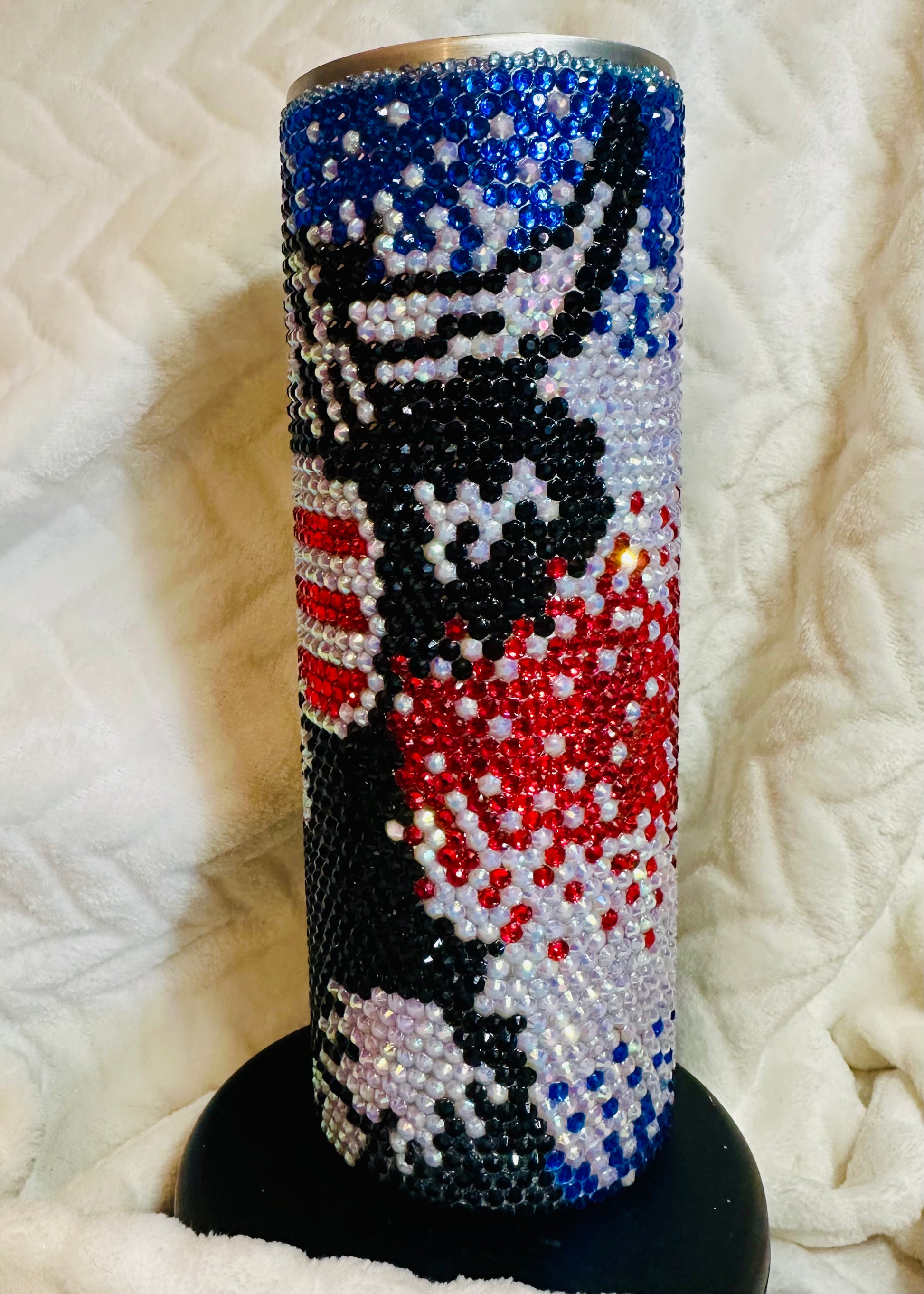 Hand made tumbler with rhinestones. It’s is art and sold as is. 20 oz tumbler. Not dishwasher safe. Not microwave safe. Hand wash only. Do not soak